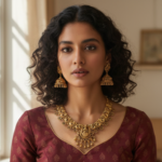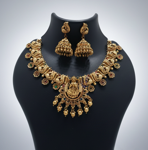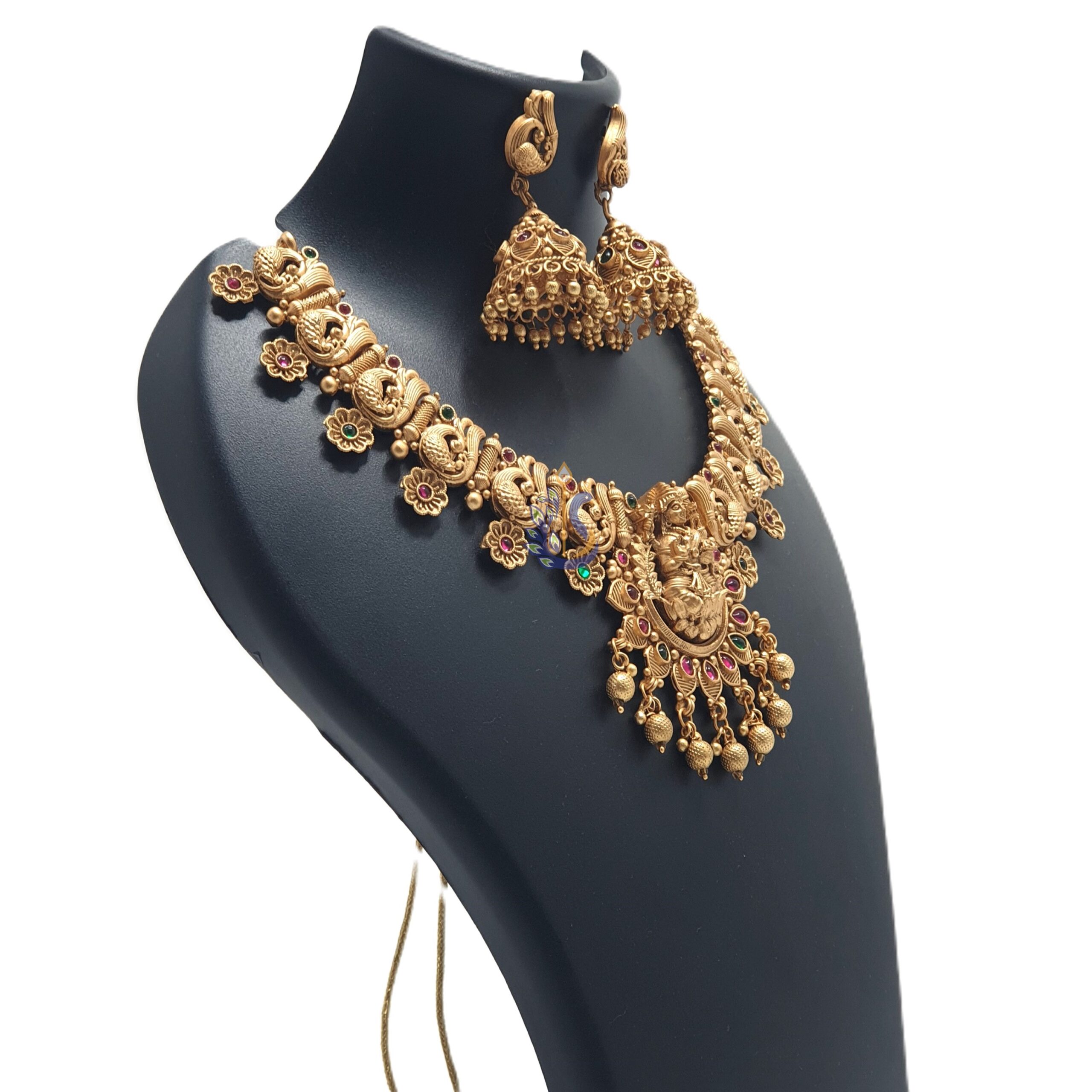 This opulent jewelry set is meticulously crafted with intricate detailing and features a luxurious gold-tone finish that captures the essence of classic Indian design.