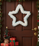 This stunning star-shaped wreath is crafted from soft, white, fluffy tinsel, creating a beautiful, sparkling, and festive look.