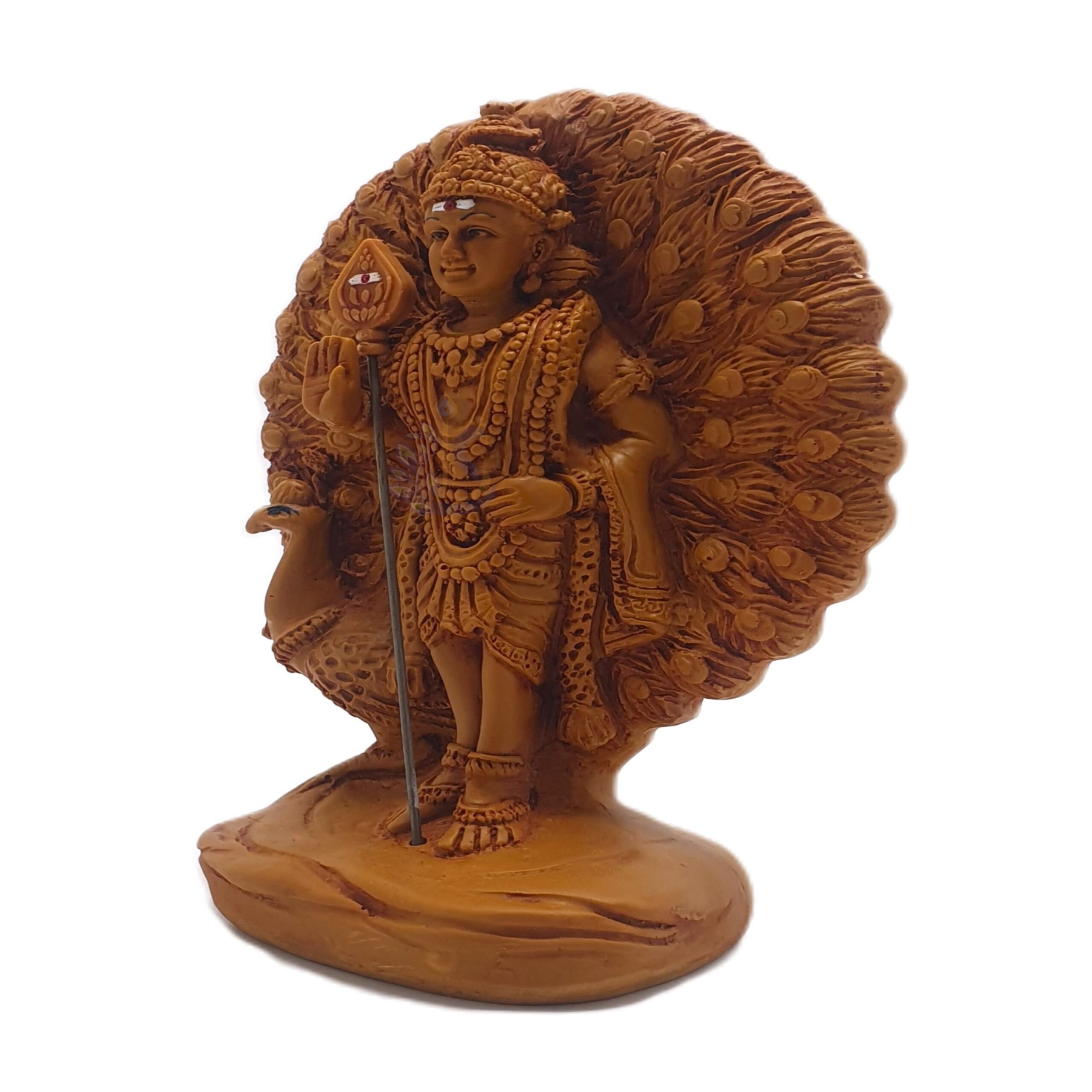 Handcrafted Wooden Color Lord Murugan Statue with Prabhavali & Peacock Vahana (Kanda/Skanda Sculpture)