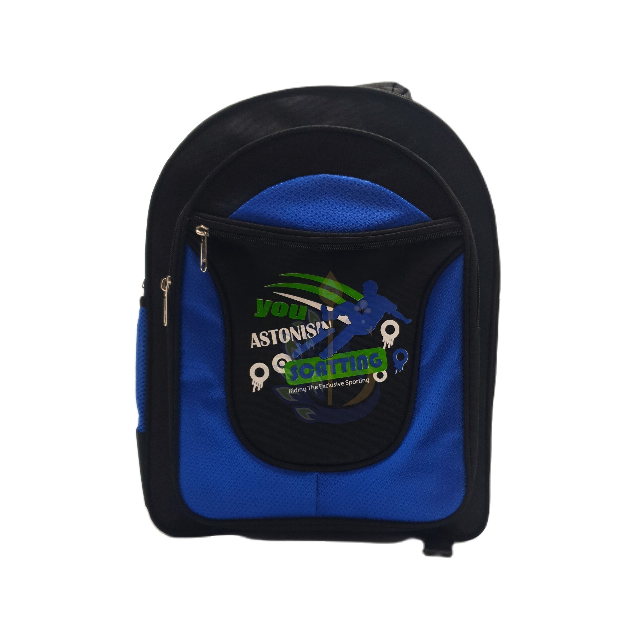 The front pocket has a graphic design that includes the words “YOUR ASTONISHING SPORTING” in green and blue lettering, along with a silhouette of a person kicking a ball (possibly a soccer ball or football).