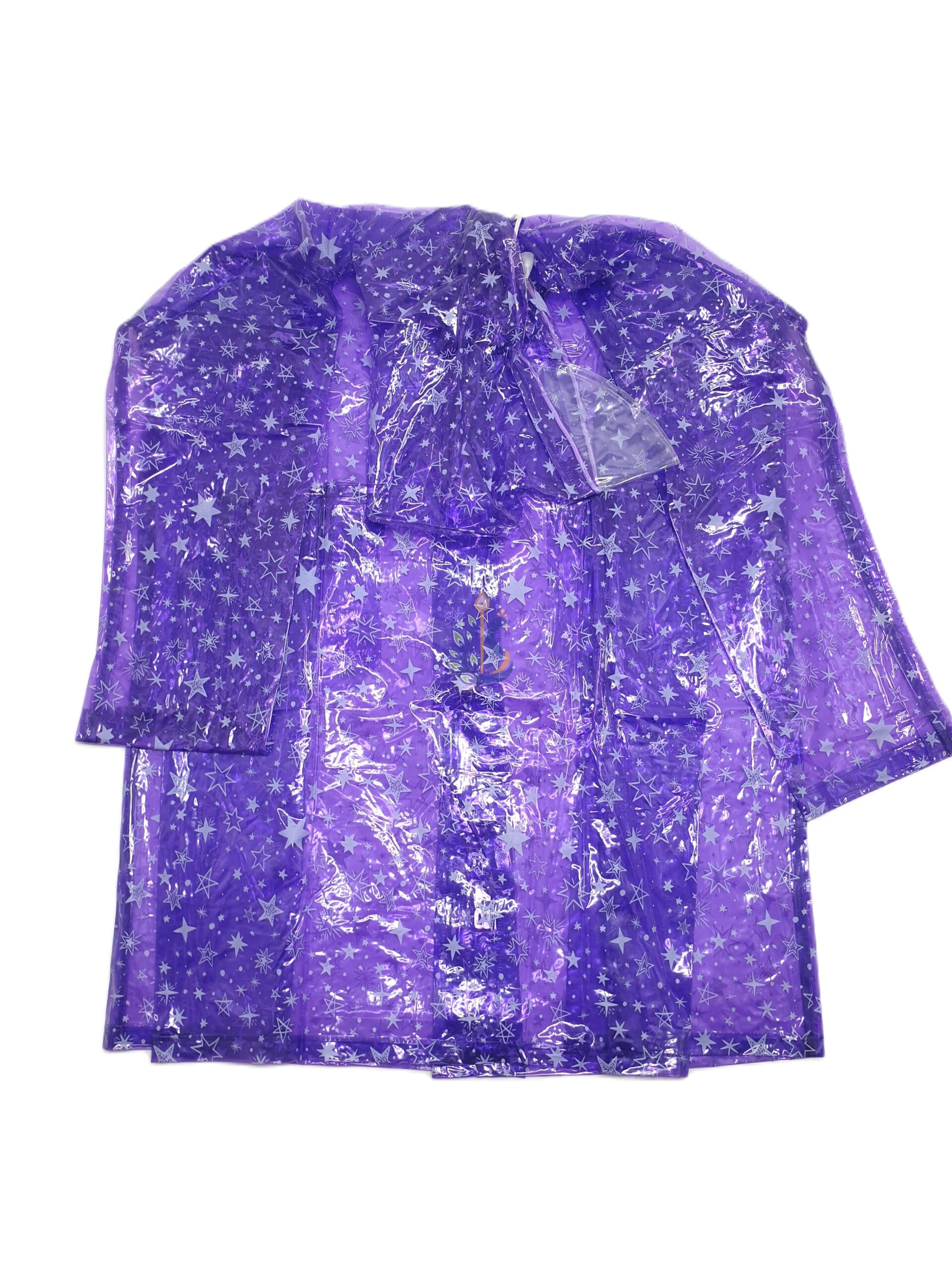 Perfect for rainy days, this lightweight, waterproof PVC jacket offers full-body protection with a secure snap-button closure and a protective hood.