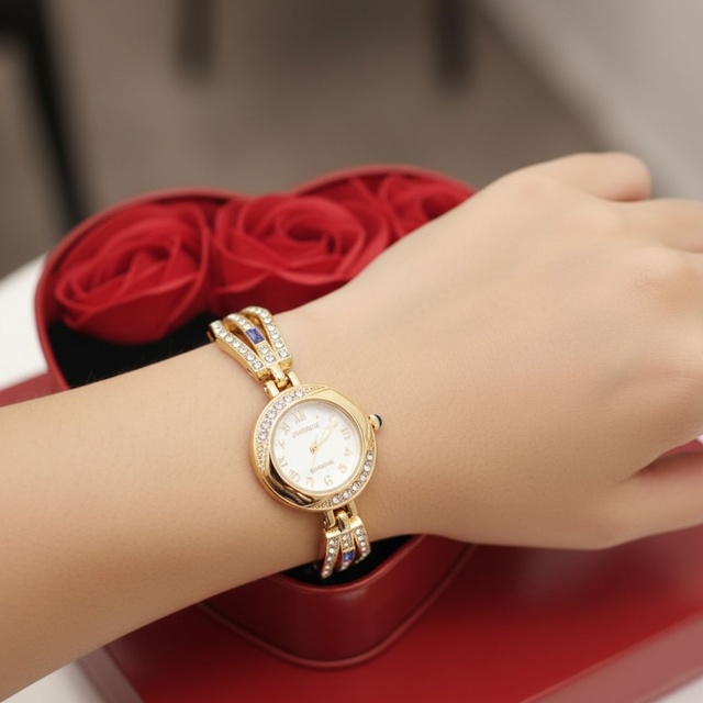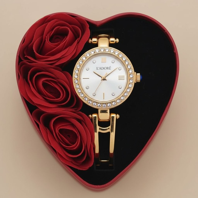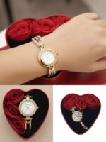 Romantic Golden Women’s Watch Gift Set with Rose Heart Box
