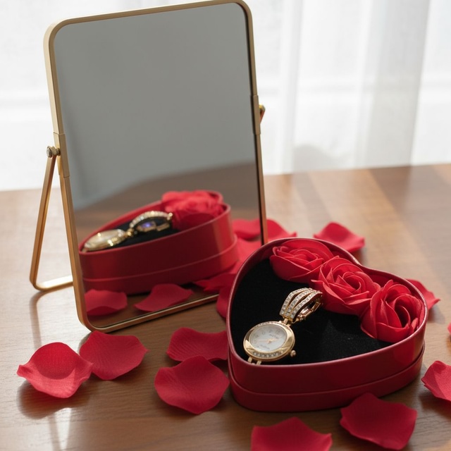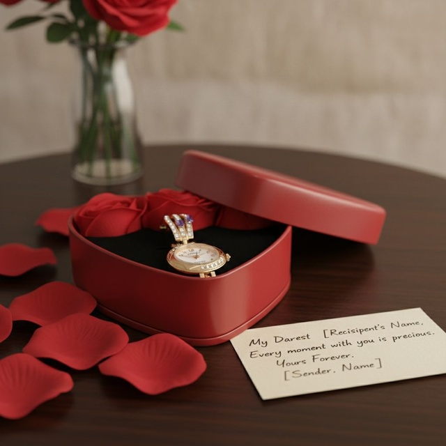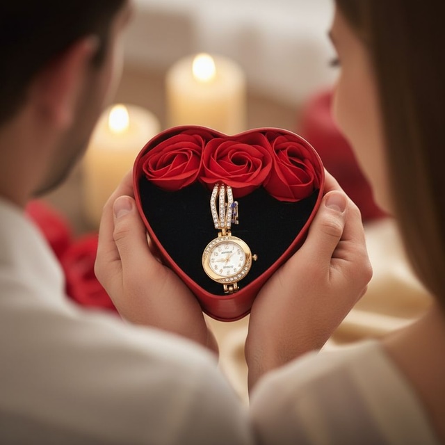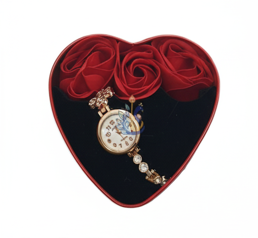 The true highlight is the luxurious presentation: the watch is nestled inside a stunning heart-shaped box filled with vibrant artificial roses, making it ready to gift.