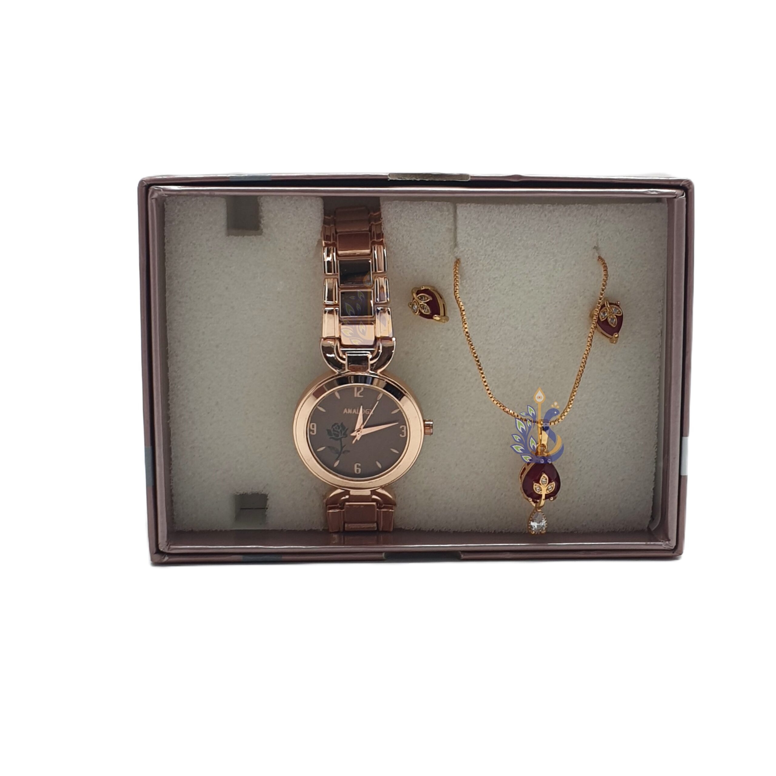 It features a beautiful rose gold-tone women’s watch with a chic, minimalist dial, elegantly paired with a matching gold-plated necklace and pendant.